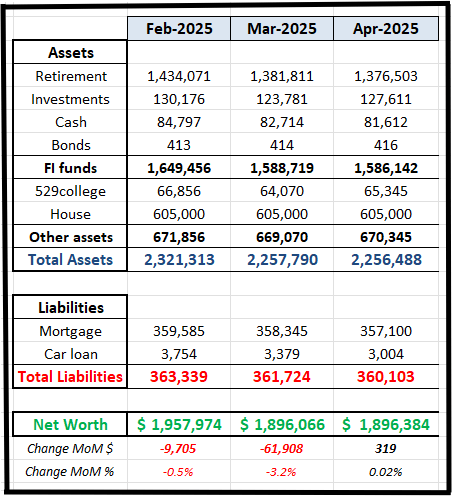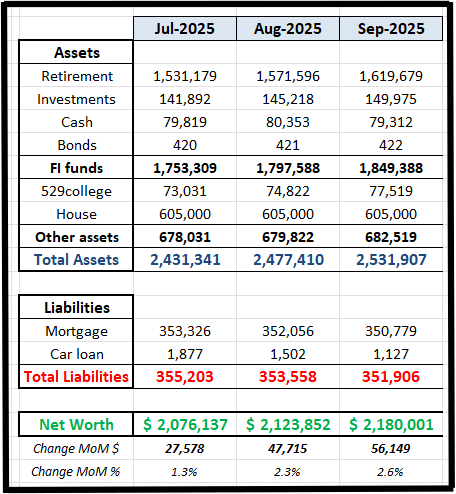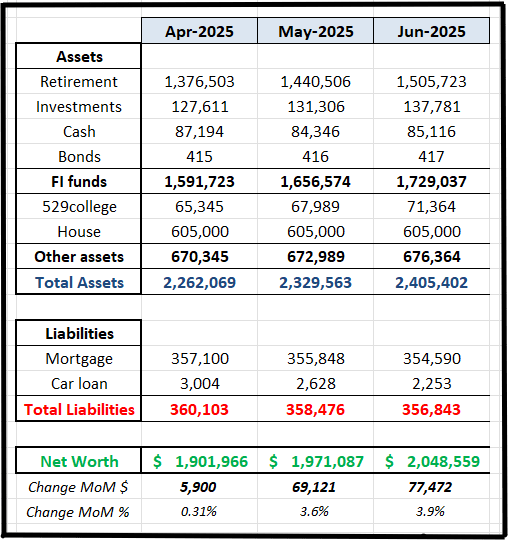 We breached the $2.5m mark in total assets. NW is at $2.18m and FI funds almost at $1.85m. All high water marks.