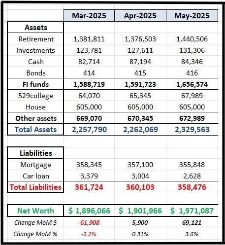 We saw a $69k increase in NW last month, a growth of 3.6% from the month before.