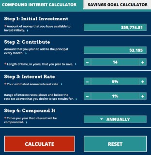 In January of 2017 we had $359,774.81 in our retirement accounts. Currently we are pumping in $3,195 every month into retirement accounts. Assuming a return of 6% annually, in 14 years, using this calculator we will have accumulated $1.6M. That is over $400k more than we need!