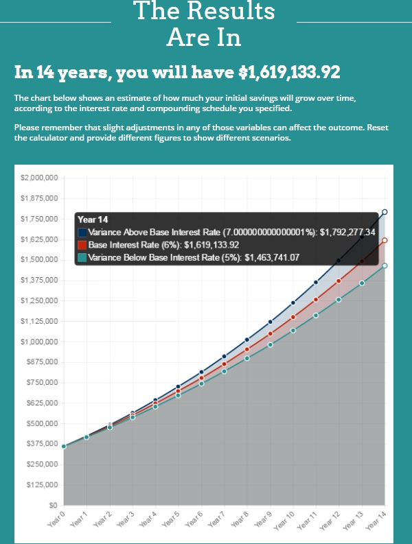 In January of 2017 we had $359,774.81 in our retirement accounts. Currently we are pumping in $3,195 every month into retirement accounts. Assuming a return of 6% annually, in 14 years, using this calculator we will have accumulated $1.6M. That is over $400k more than we need!