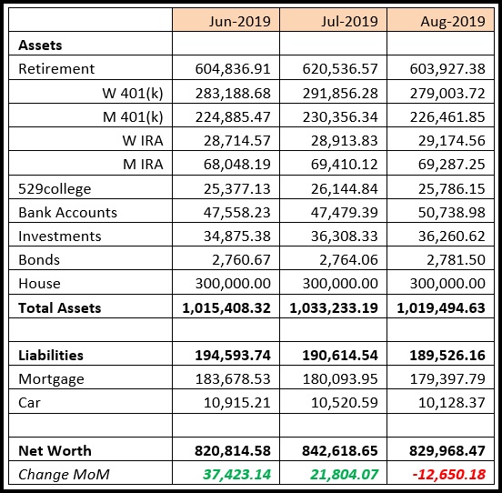 August was the second month this year that our net worth dipped by over $12K. And that’s ok. How ok? Even with the monthly dip, our net worth is over $144K for the year! Frankly, the market run we’ve been having is almost unprecedented and it is bound to end at some point. But from that end it will rise again. All is good.