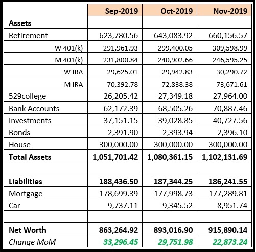 Net worth reaches another high of $915k. Buzz of an impending recession is everywhere but we still plow into our tax advantaged and taxable accounts. We are also hoarding some cash. The recession will come but we don’t, and neither does anyone else, know when. And it will pass too.