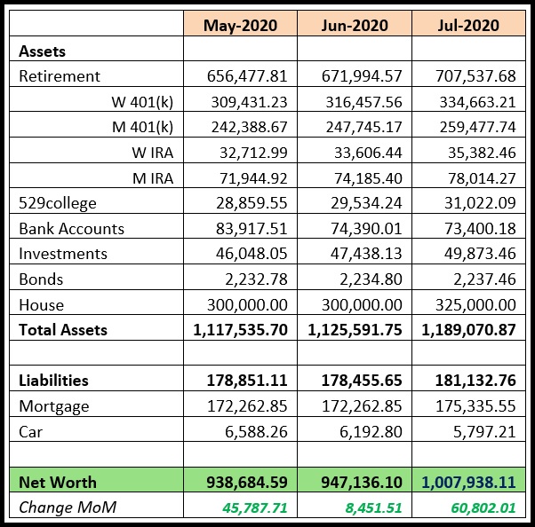 • We also increased the valuation of our home – from $300k to $325k. In June when we almost put our home on the market, the list price that we had talked to our agent was around the $350k mark. Based on the market assessment our realtor did, we would have likely ended up with an offer more than the list price. BUT, we didn’t actually list it and consequently didn’t receive any offer or had an official appraisal done. So, being very conservative, we decided that the base value of the home should be $325k for the purpose of calculating our net worth.