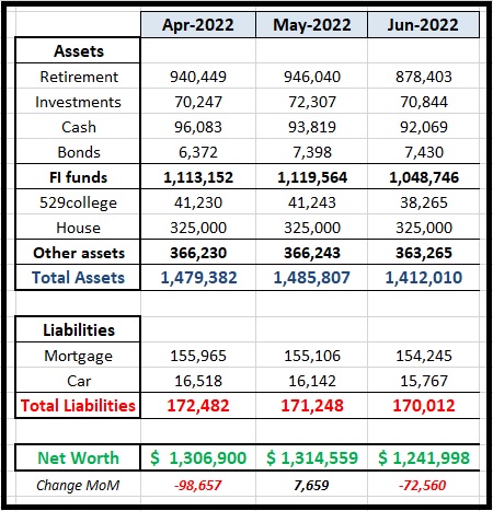 Well, June didn’t turn May’s respite into something more 🙂 Instead, our NW ended up falling by over $72k.
