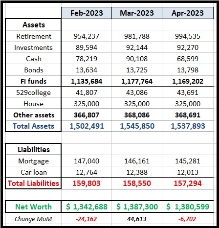 Net worth went down by $22k or 1.5%, after two splendid months of gains.