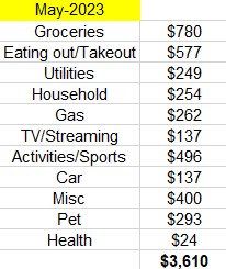 Groceries is at a new normal while eating out is probably a bit higher. Overall spending is a right around the average of $3.5k.