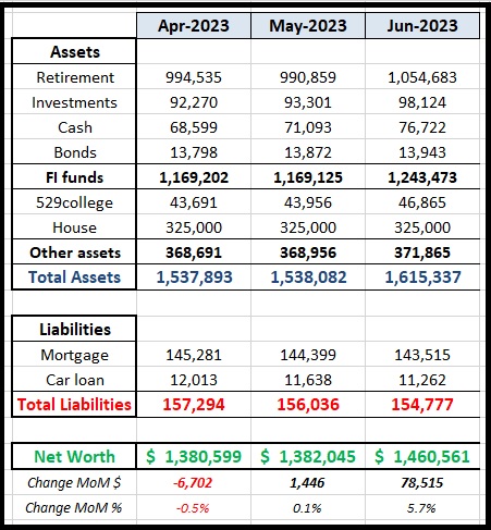The last time NW was in the $1.4m was back in December ’21. The stock market has been on a tear in the past few months and it shows in our numbers. At the half-way mark in 2023, the S&P500 is up 15.6%. Up 6.4% in June alone. NW jumped by ~$78k, the most ever in a single month. Talks of recessions seems like a distant dream …or is it? Who knows?! We’ll take what is given and leave the prognosticators to fight it out, you know, with their telling of the future.